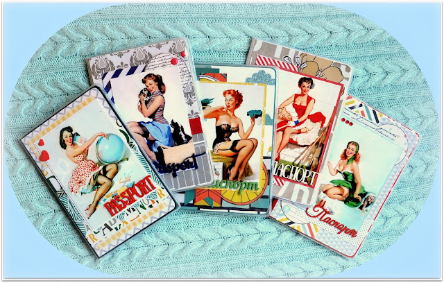 В прошлом году я впервые применила картинки пин-ап для декорирования обложек паспортов (их можно увидеть здесь), и неоднократно слышала от их обладательниц, какой интерес вызывает у окружающих их ранее краснокожая паспортина...